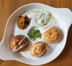 Entrees started with a typical Sri Lankan and South Indian dish called Gundappam. A relief to the palate after the spiciness of the first two courses, these ‘crepe balls’ cooked in a Dutch oven were blissfully mild, fluffy and soft. Paired with a roasted coconut chambal (sambal) and a coconut chutney, it was the perfect pause between the starters and the main course.